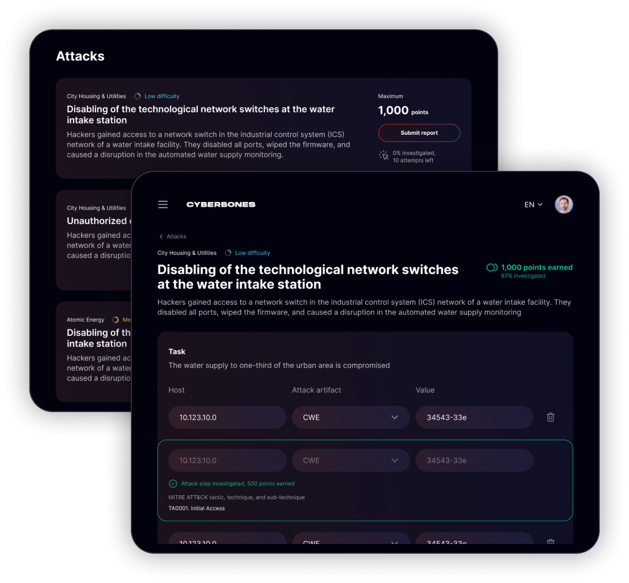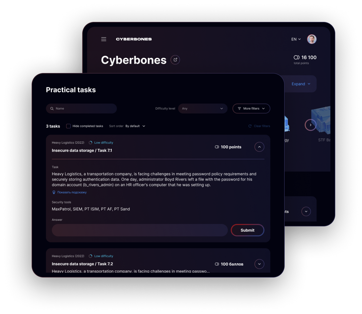 Standoff Cyberbones PRO version features 70+ diverse tasks based on Standoff Cyberbattle incidents, including complex attack chains.